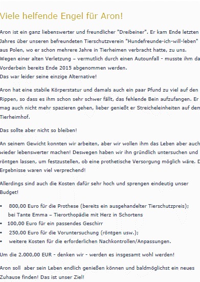 Viel zu viele Jahre musste der arme Aron in Tierheimen leben bis er nun endlich sein Glück gefunden hat. Ihm und seinem tollen Frauchen wünschen wir von Herzen alles Gute und ganz viel Freude miteinander!
