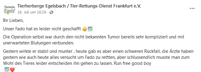 Dem blinden Fado mussten wegen einem viel zu hohen Augeninnendruck beide Augen entfernt werden. Während der OP wurde hinter dem rechten Auge ein großer Tumor entdeckt, den man soweit möglich mit entfernt hatte. Allerdings gab es an diesem Auge sehr starke Nachblutungen, die nur schwer unter Kontrolle zu bringen waren. Dann der große Schock...