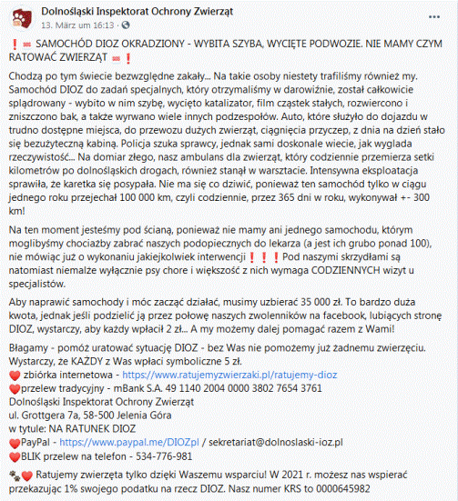 Es gibt rücksichtslose Krankheiten auf dieser Welt ... Leider sind wir auch auf solche Menschen gestoßen. Das DIOZ-Auto für besondere Aufgaben, das wir als Spende erhalten haben, wurde vollständig geplündert - die Windschutzscheibe war kaputt, der Katalysator wurde geschnitten, der Feinstaubfilm, der Tank wurde gebohrt und zerstört und viele andere Komponenten wurden abgerissen. Ein Auto, mit dem man über Nacht zu schwer erreichbaren Orten fuhr, große Tiere transportierte, Anhänger schleppte, wurde über Nacht zu einer nutzlosen Kabine. Die Polizei sucht nach dem Täter, aber Sie wissen genau, was die Realität ist ... Um die Sache noch schlimmer zu machen, stand auch unser Tierkrankenwagen, der täglich Hunderte von Kilometern auf den Straßen von Niederschlesien fährt, in einer Werkstatt. Aufgrund intensiver Ausbeutung brach der Krankenwagen zusammen. Es ist nicht überraschend, denn dieses Auto legte in nur einem Jahr 100.000 km zurück, d. H. Jeden Tag, 365 Tage im Jahr, legte es + - 300 km zurück! Im Moment stehen wir an der Wand, weil wir kein einziges Auto haben, mit dem wir unsere Anklage sogar zum Arzt bringen könnten (und es gibt weit über 100 von ihnen), ganz zu schweigen von der Durchführung einer Intervention ❗️❗️❗️