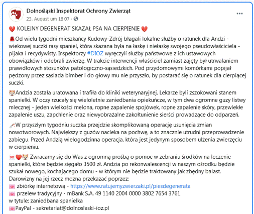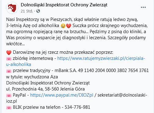 Unsere Inspektoren sind in Pieszyce, von wo aus sie die kaum lebende 3-jährige Aza vor einem Alkoholiker retten. 😢💔 Die Hündin ist nicht nur extrem abgemagert, sondern hat auch eine große eiternde Wunde am Bauch ... Wir bringen den Hund in die Klinik und bitten Sie, die Diagnose und Behandlung zu unterstützen. Wir werden bald Details bereitstellen ...