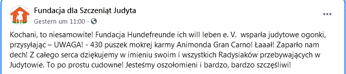 Leute, es ist unglaublich! Die Stiftung Hundefreunde ich will leben e. V. unterstützte die Judytowo durch Senden von - ACHTUNG! - 430 Dosen Animonda Gran Carno Nassfutter! Es hat uns den Atem geraubt! Wir bedanken uns von ganzem Herzen und im Namen aller in Judytów lebenden Radysiak. Es ist einfach wunderbar! Wir sind fassungslos und sehr, sehr glücklich!