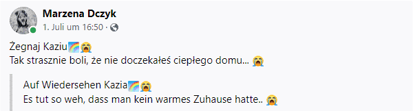 Beschreibung: Kaziu kam am 13.08.2021 in sehr vernachlässigtem Zustand als Fundhund zu uns ins TH. Er ist ein großer, langhaariger Hund, ein bisschen wie ein Neufundländer. Obwohl Kaziu etwas älter ist, macht er gerne längere Spaziergänge und ignoriert dann auch alle entgegenkommenden Hunde. Wenn Rüden ihm aber zu nahe kommen, knurrt er sie an. Hündinnen mag er definitiv lieber, ist aber gerne ihr Boss. Bei Katzenbegegnungen ist er zwar aufgeregt, aber sehr interessiert. Vielleicht kennt er diese aus seinem früheren Zuhause. Bei zu langen Pflegemaßnahmen oder beim Tierarzt kann man Kaziu problemlos einen Maulkorb anlegen. Menschen gegenüber ist Kaziu sehr freundlich und sanft im Umgang. Es kann sein, dass er nur noch wenig hört oder sogar taub ist, weil er auf Ansprache nicht reagiert.
