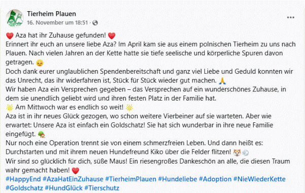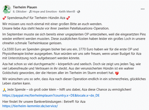 https://www.freiepresse.de/vogtland/plauen/spendenaktion-im-plauener-tierheim-huendin-aza-soll-schmerzfrei-leben-koennen-artikel13861714?fbclid=IwY2xjawLL1qVleHRuA2FlbQIxMQABHm8w0foGIUtXoqPIdR3U7gzoCaG74q-X3IZx0Q2K2hn6qT52SDqNsKYEBRO0_aem_8laSfcjMsIAD6MaV0sCmNg